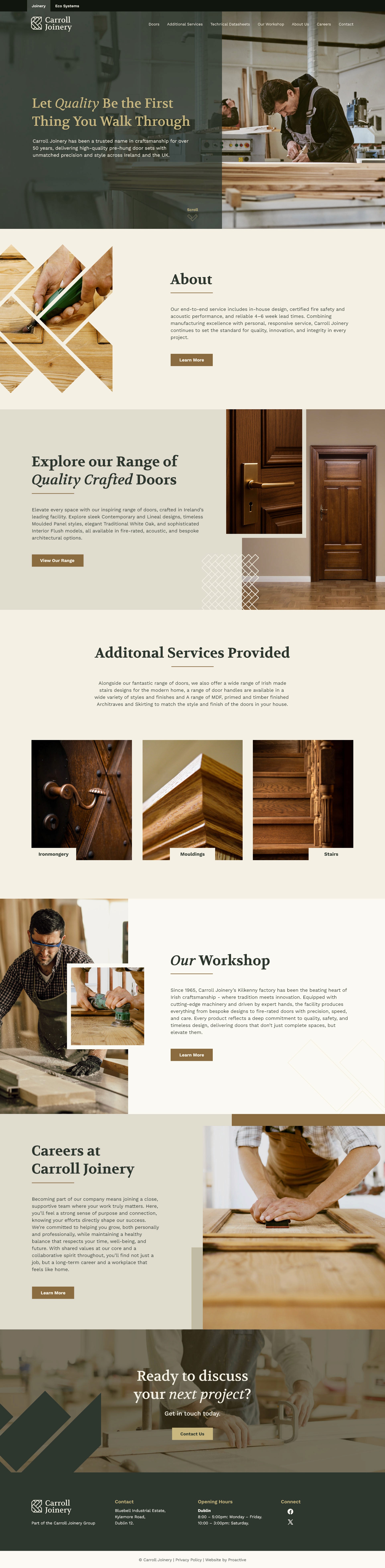 Designed refined brand and web concepts combining confident typography, clean layouts, and subtle references to wood joints and door construction. Although not selected, the direction was well received and demonstrates how heritage trades can be repositioned with clarity and confidence.