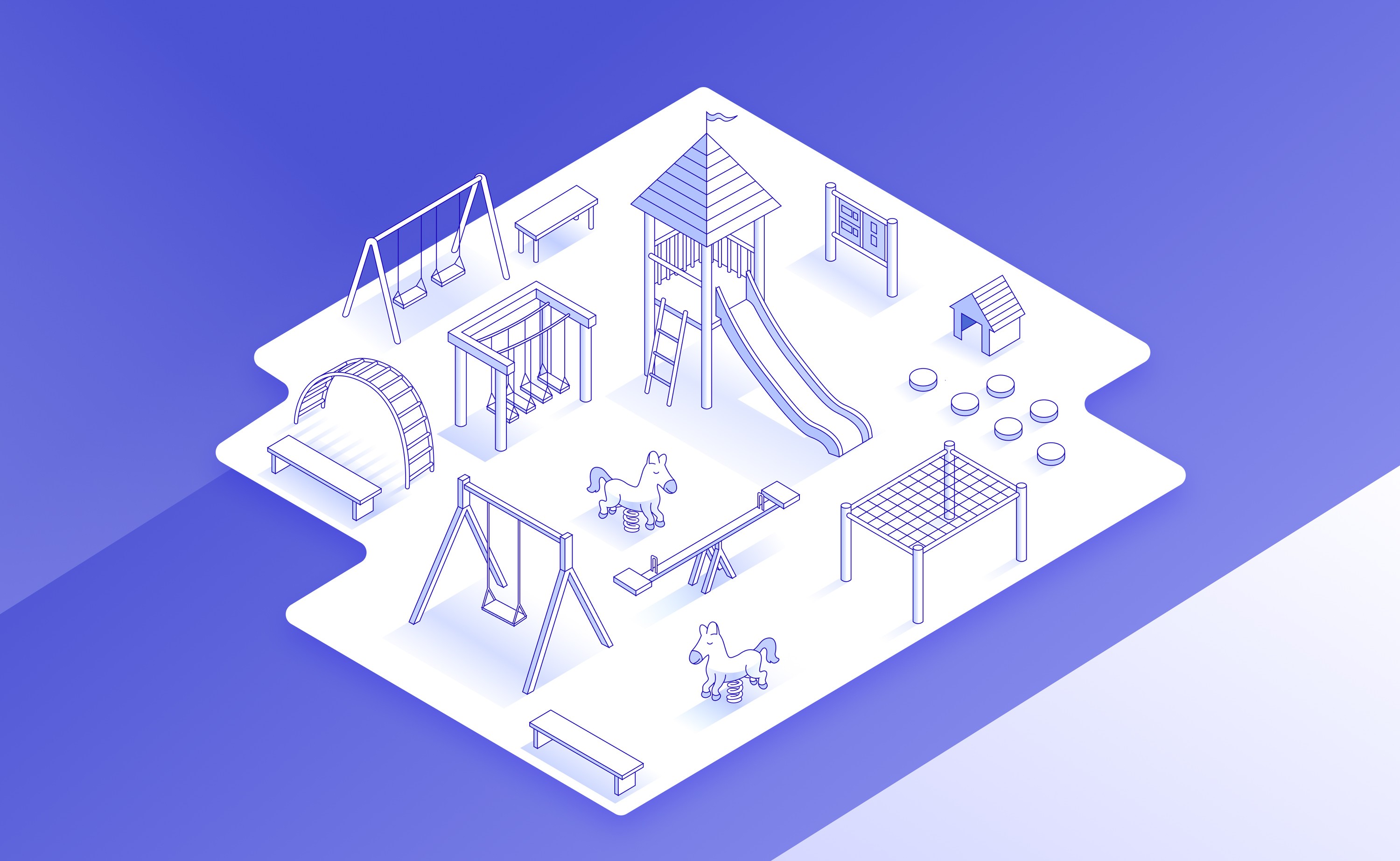 Developed a vibrant purple palette and a flexible asset system built around an isometric playground illustration. Subtle ruler inspired details reinforce structure, resulting in a brand that feels engaging, confident, and controlled.